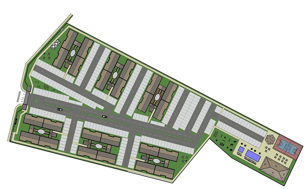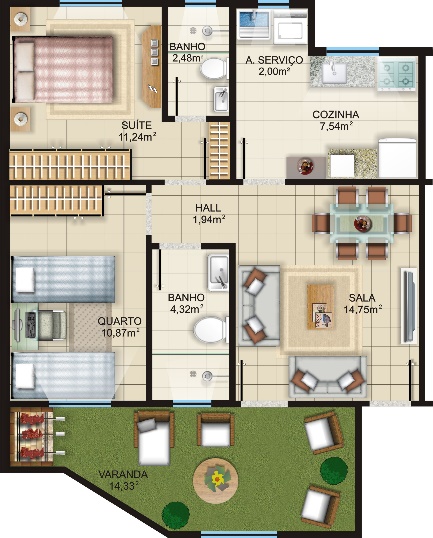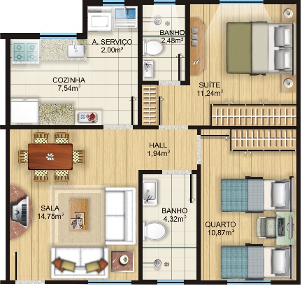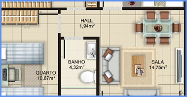 São 264 apartamentos TIPO “A”, com área construída de 55,62m², composto de dois dormitórios, sendo um suíte, uma sala, um hall de circulação, um banheiro social, uma cozinha com área de serviços;