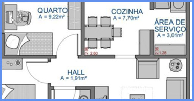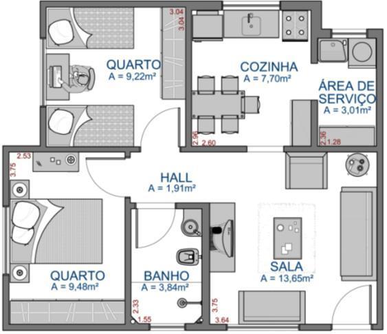 Cada apto possui área construída de 55,29m², sendo compostos de 2 dormitórios, 1 sala de estar, hall de circulação, banheiro social, cozinha e área de serviços;