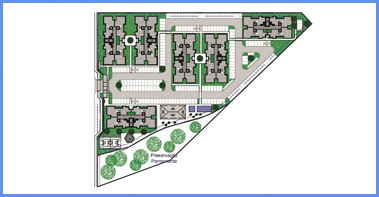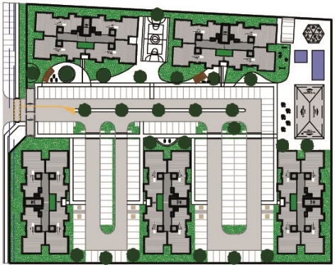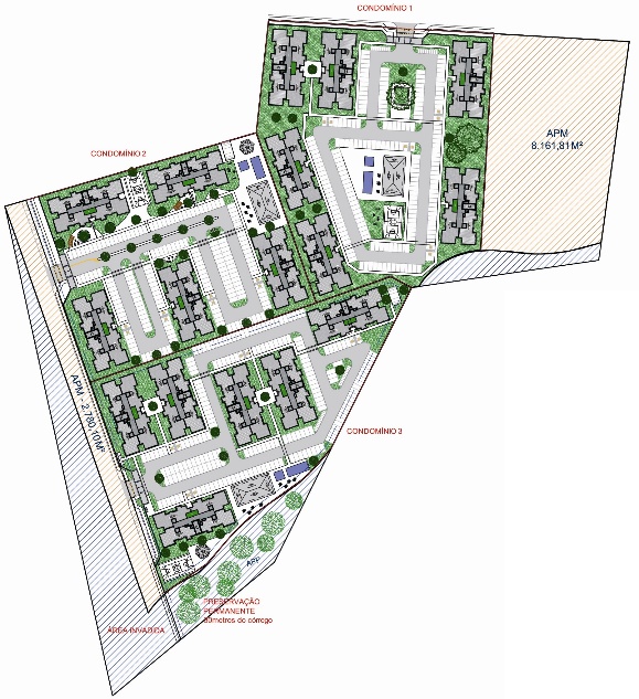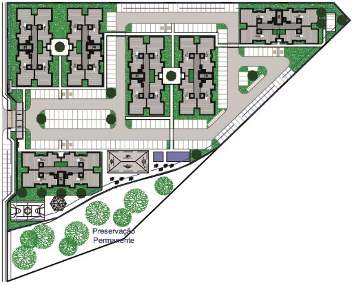 Composto por 3 condomÃnios com 17 edifÃcios de 4 pavimentos e 32 aptos por edifÃcio, totalizando 544 apartamentos de 2 quartos;