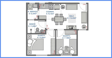 Cada apto possui 45,77m² de área construÃda, sendo composto de 1 sala de estar e jantar, 2 dormitórios, hall de circulação, 1 banheiro social, 1 cozinha e área de serviços;