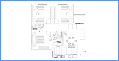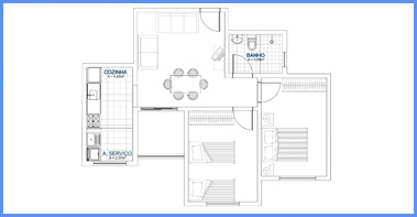 Os aptos de 2 quartos possuem 55,22m² de área construída, sendo composto de 1 sala de estar e jantar, varanda, 2 dormitórios, hall de circulação, banheiro social, cozinha e área de serviços;