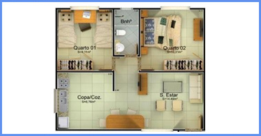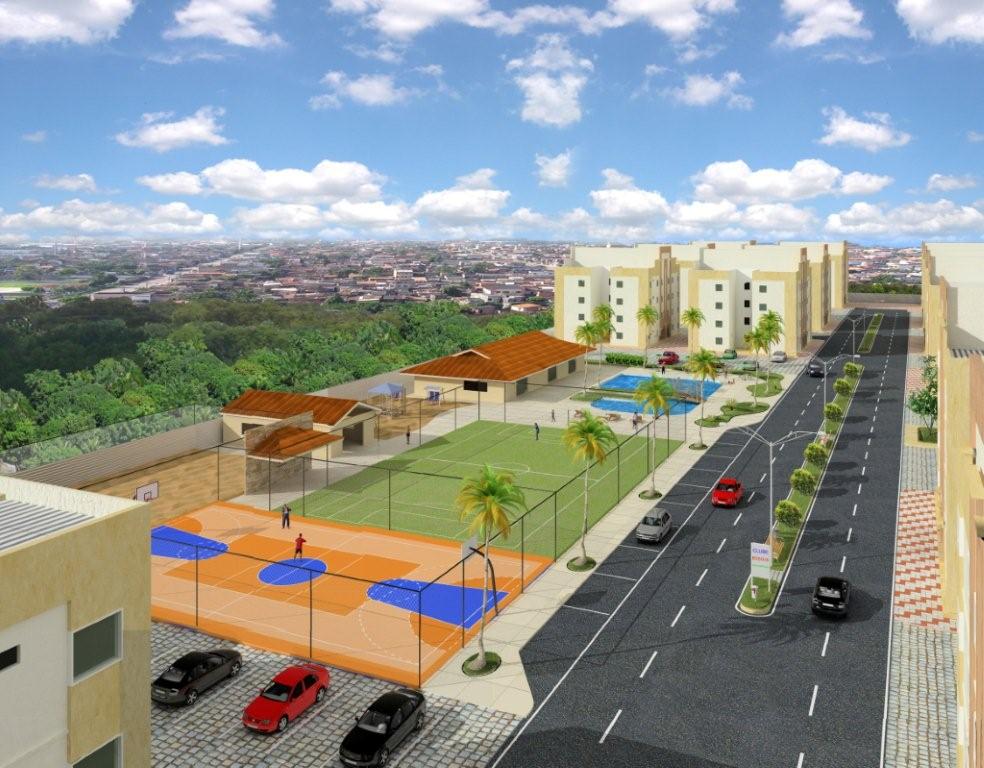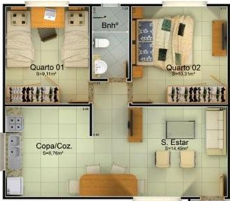 Cada apartamento possui 49,76m² de área construída, sendo composto de 1 sala de estar, varanda, 2 dormitórios, hall de circulação, 1 banheiro social, 1 cozinha e área de serviços;