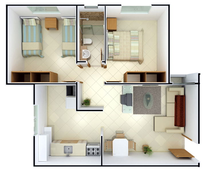 Cada apartamento possui 51,28m² de área construÃda, sendo composto de 1 sala de estar, 2 dormitórios, hall de circulação, 1 banheiro social, 1 cozinha e área de serviços;