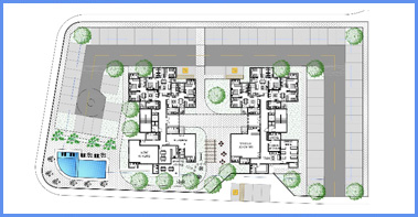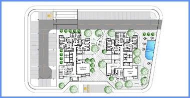 • O condomínio V foi projetado numa área de 11.591,82m² e possui 3 edifícios de 8 pavimentos, todos com 4 aptos por pavimento, num total de 96 apartamentos de 3 quartos com suíte;