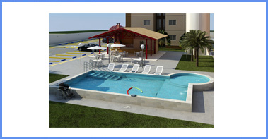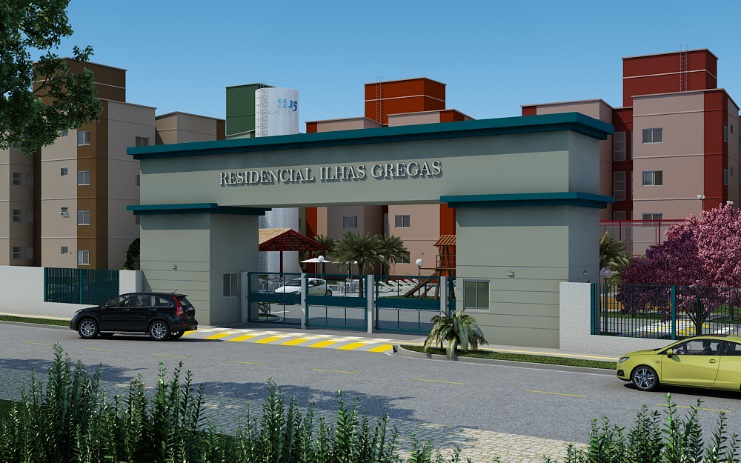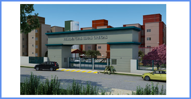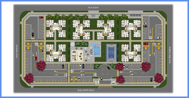 Condomínio com 6 edifícios de 4 pavimentos, com 4 apartamentos por pavimento, totalizando 96 unidades e 4.838,94m² de área construída;