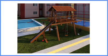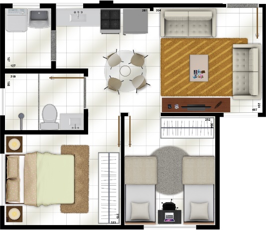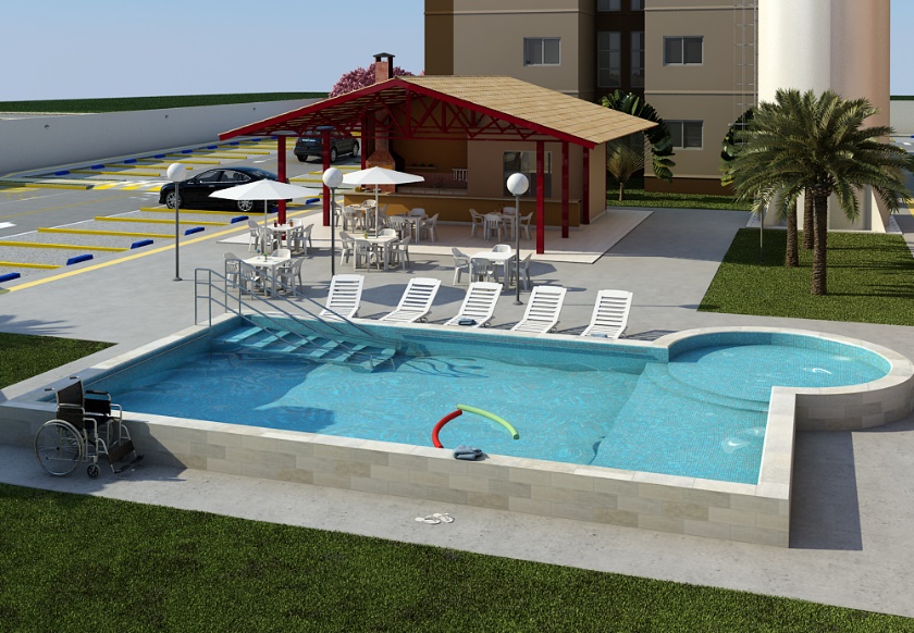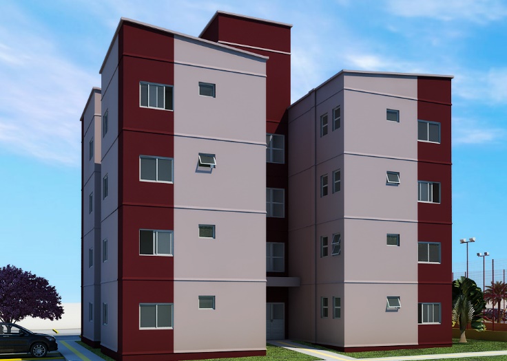 Cada apto possui área construída de 42,94m², sendo compostos de 2 dormitórios, 1 sala de estar, hall de circulação, banheiro social, cozinha e área de serviços;