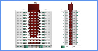 Condomínio com 4 edifícios de 12 pavimentos, com 4 aptos de 2 quartos e 4 aptos de 3 quartos por pavimento tipo, sendo 192 de 2 quartos (sendo 1 suíte) e 192 de 3 quartos (sendo 1 suíte), totalizando 384 unidades e 32.208,80m² de área construída;