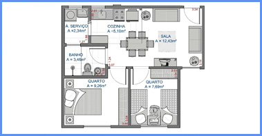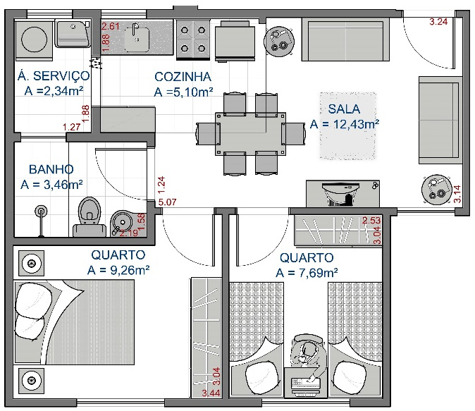 Cada apto possui área construída de 45,77m², sendo compostos de 2 dormitórios, 1 sala de estar, hall de circulação, banheiro social, cozinha e área de serviços;