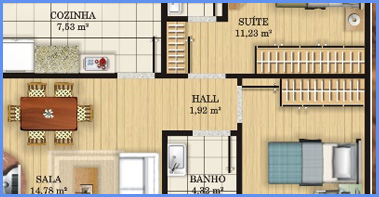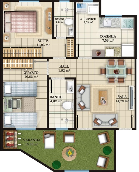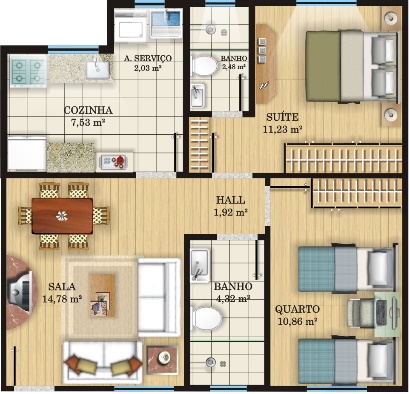 O apto Tipo “A†possui 61,05m² de área construÃda, sendo composto de 1 sala de estar e jantar, 2 dormitórios (sendo 1 suÃte), hall de circulação, 1 banheiro social, 1 cozinha e área de serviços;