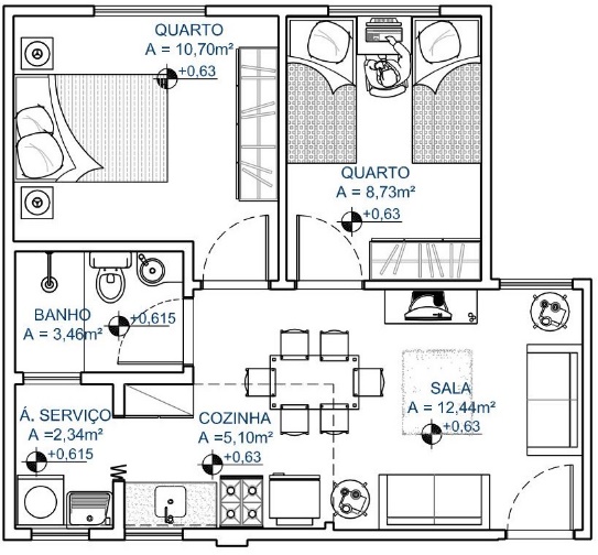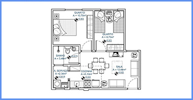 O apartamento possui 45,77m² de área construída, sendo composto de 1 sala de estar, 2 dormitórios, 1 banheiro social, 1 cozinha, 1 área de serviços e área de circulação;