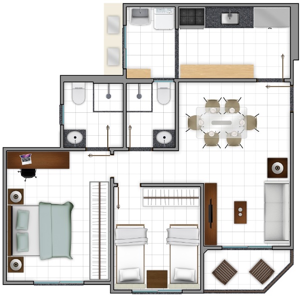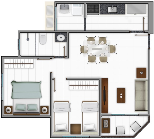 O apto Tipo “B” 67,06m² de área construída, sendo composto de 1 sala de estar, varanda, 2 dormitórios (sendo 1 suíte), hall de circulação, 1 banheiro social, 1 cozinha e área de serviços;