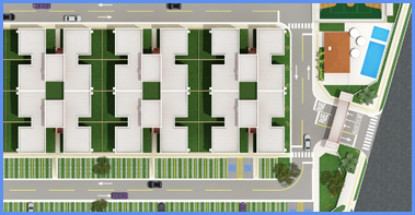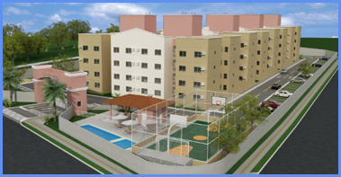 Condomínio com 4 edifícios de 4 pavimentos, com 8 apartamentos por pavimento, totalizando 128 unidades e 6.658,81m² de área construída;