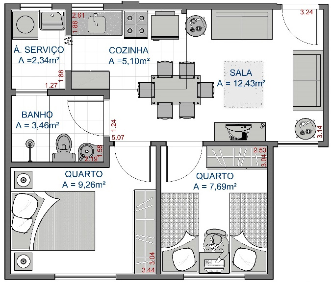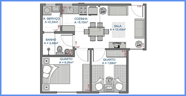 Cada apto possui área construída de 45,77m², sendo compostos de 2 dormitórios, 1 sala de estar, hall de circulação, banheiro social, cozinha e área de serviços;