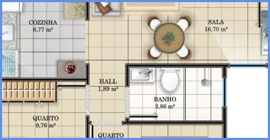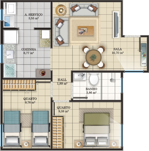 Os apartamentos possuem área construída de 50,39m² e são compostos de dois dormitórios, uma sala, um hall de circulação, um banheiro social, uma cozinha com área de serviços;