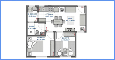 Cada apto possui 45,77m² de área construÃda, sendo composto de 1 sala de estar e jantar, 2 dormitórios, hall de circulação, 1 banheiro social, 1 cozinha e área de serviços;