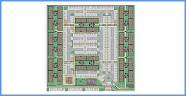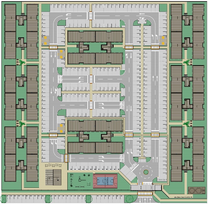 Condomínio com 8 edifícios de 4 pavimentos, com 32 apartamentos por edifício, totalizando 256 unidades;