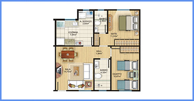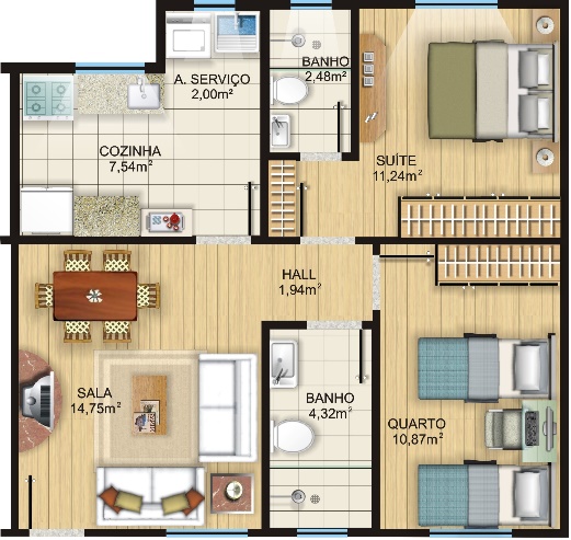 O Apto Tipo possui área construída de 62,35m², sendo composto de 2 dormitórios (sendo 1 suíte), sala de estar e jantar, hall de circulação, banheiro social e cozinha com área de serviços;