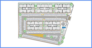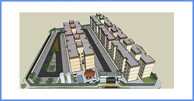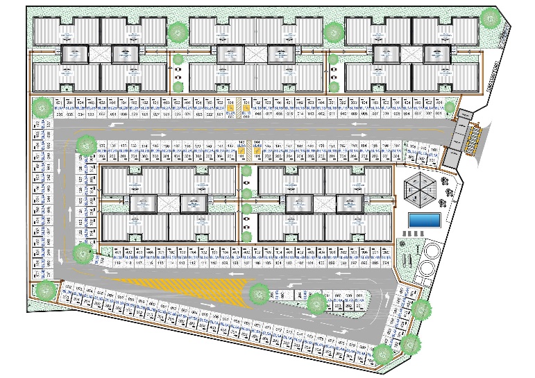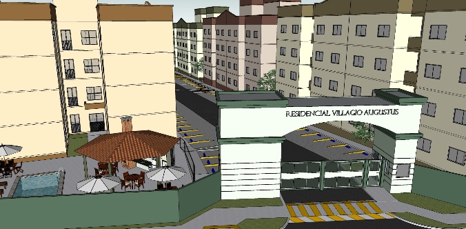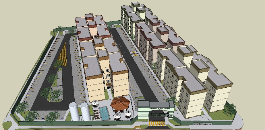 Condomínio com 5 edifícios de 4 pavimentos, com 32 apartamentos por edifício, totalizando 160 unidades e 8.513,06m² de área construída;