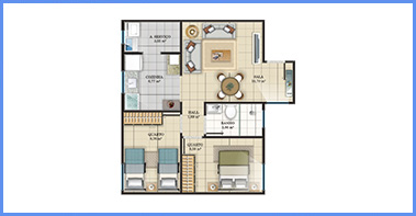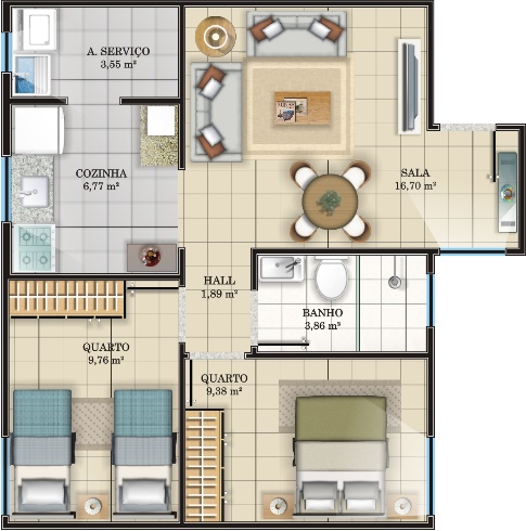 O Apto Tipo possui área construída de 46,55m², sendo composto de 2 dormitórios, sala de estar, hall de circulação, banheiro social e cozinha com área de serviços;