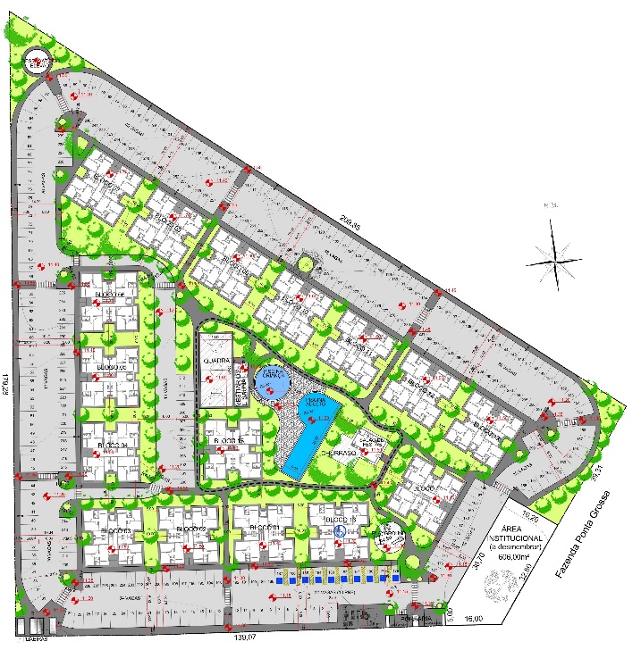 Condomínio com 15 edifícios de 5 pavimentos, com 20 apartamentos por edifício, totalizando 300 unidades e 22.556,20m² de área construída;