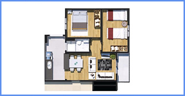 O apartamento tipo possui 51,87m² de área construída, sendo composto de 1 sala de estar, varanda, 2 dormitórios, hall de circulação, 1 banheiro social, 1 cozinha e área de serviços;